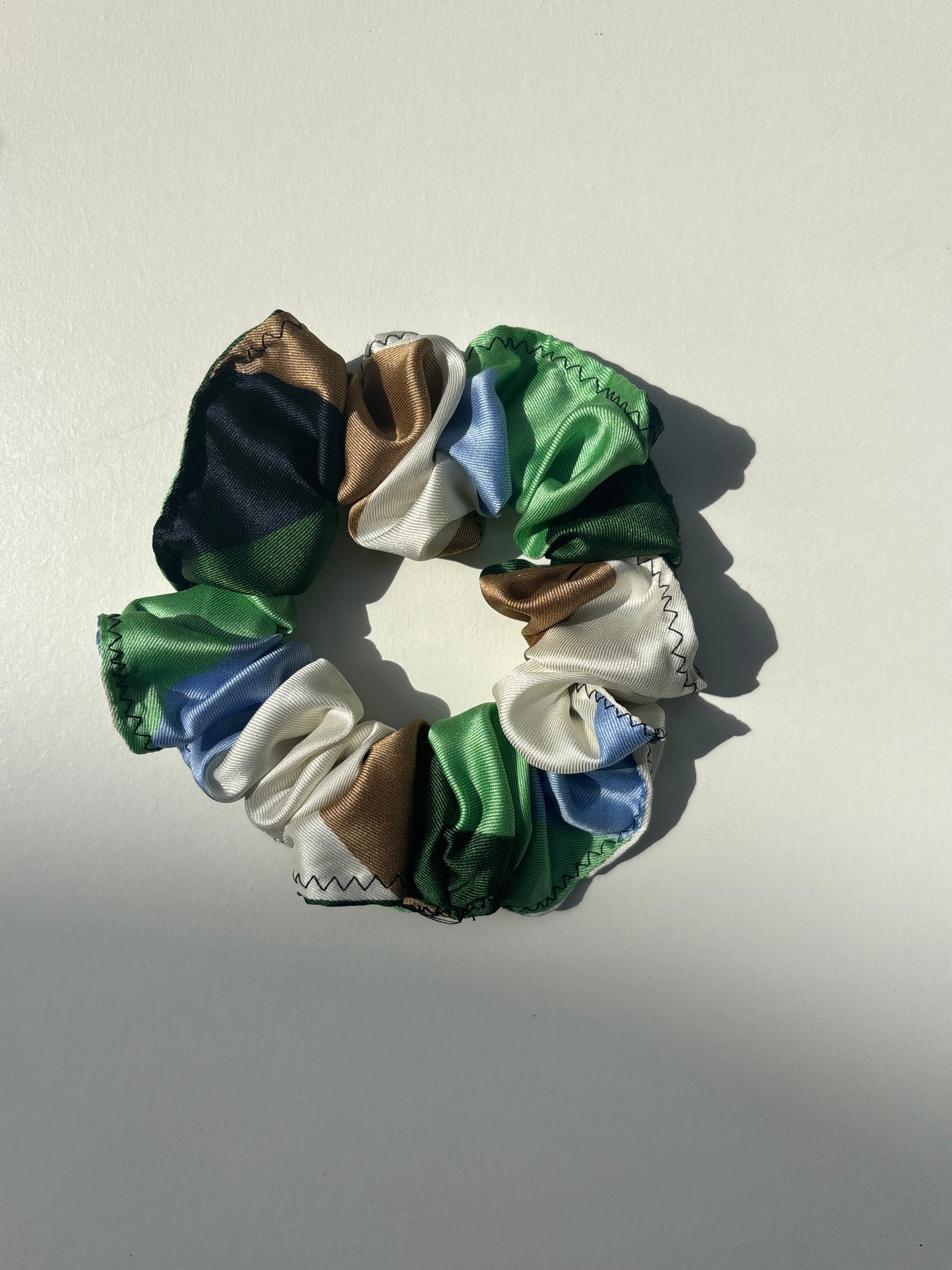 Porta nei tuoi capelli i colori della natura con questo scrunchie in raso dalle sfumature verde, azzurro, bianco e marrone. Un accessorio elegante e raffinato che unisce stile e praticità: il tessuto morbido e lucente avvolge i capelli senza tirarli né rovinarli, lasciandoli sempre in ordine e senza segni.