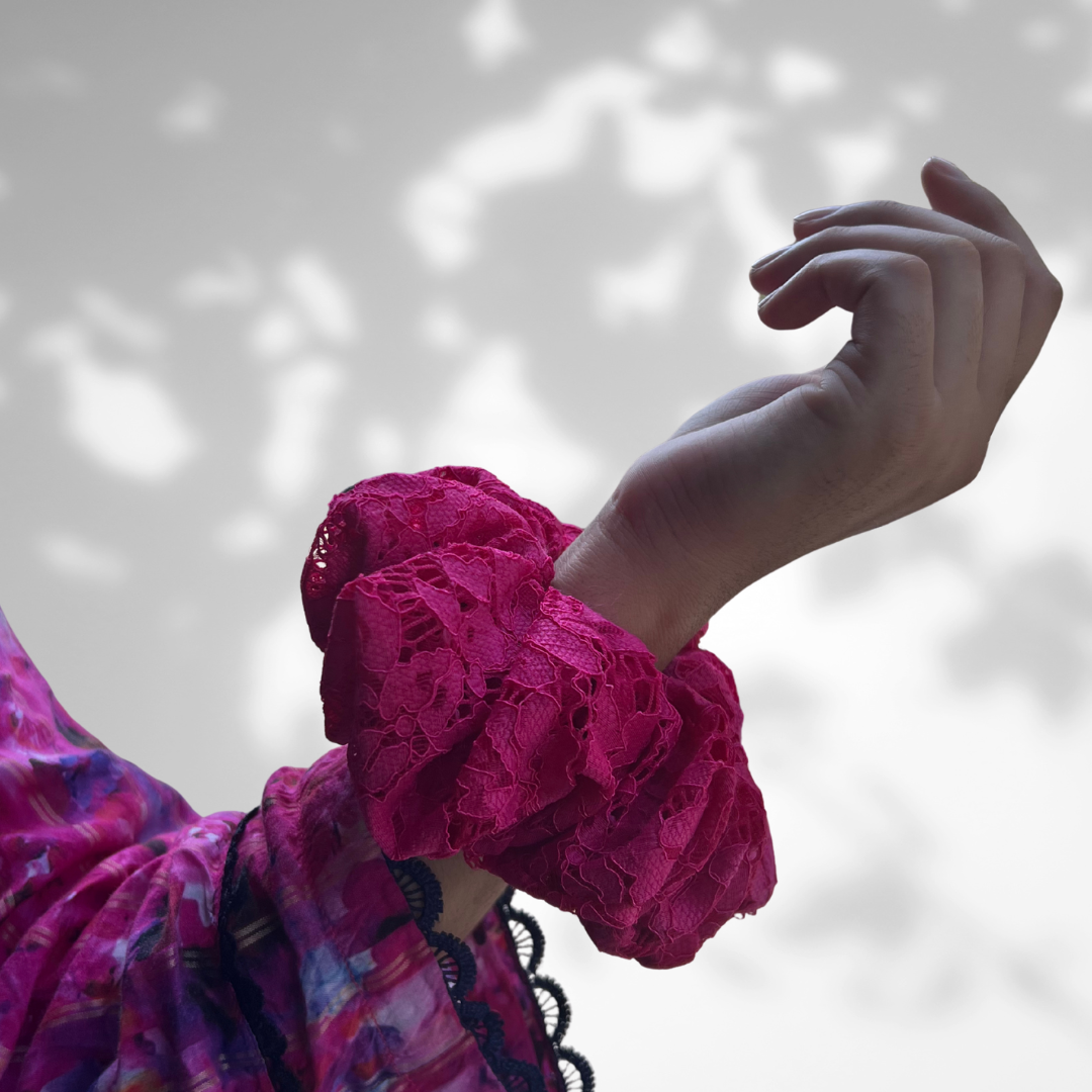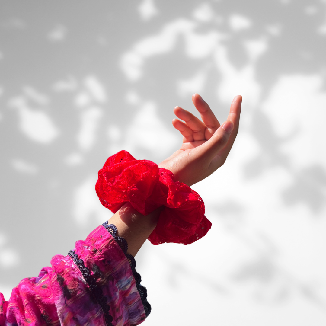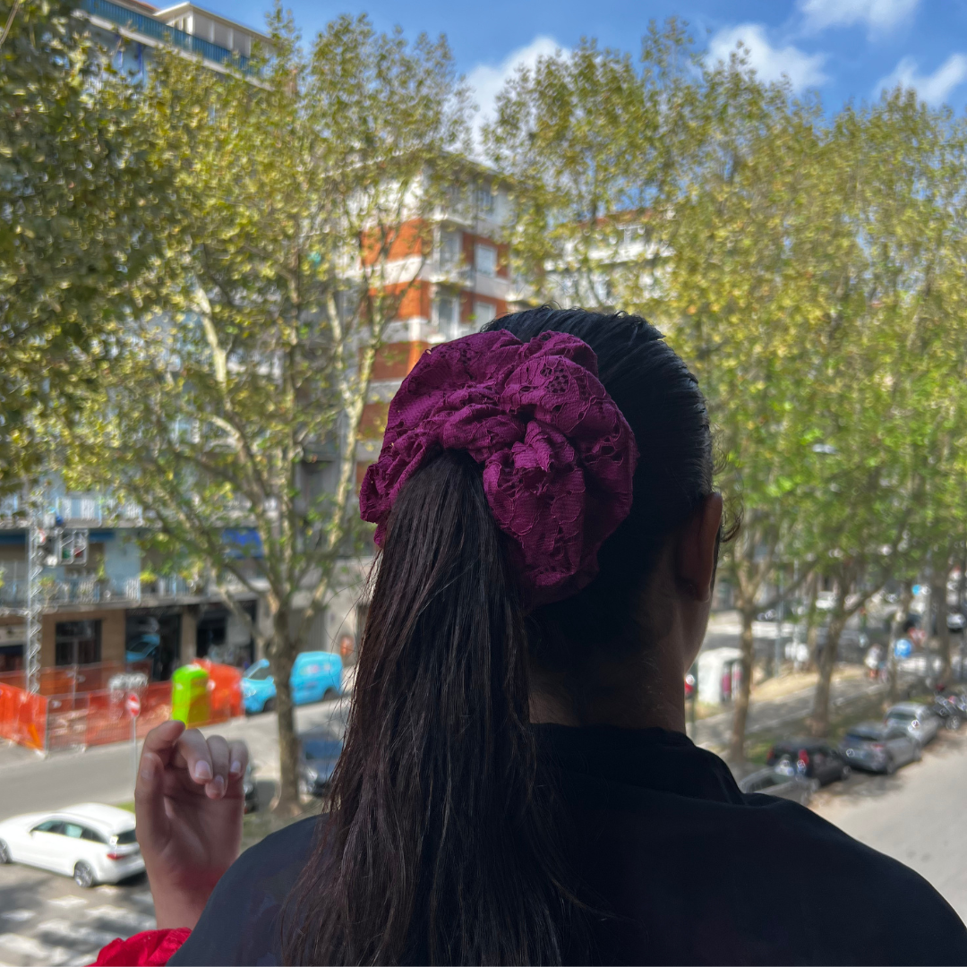 Aggiungi un tocco di eleganza al tuo look quotidiano con i nostri Scrunchies in Pizzo, disponibili in quattro splendidi colori: rosso intenso, viola reale, blu petrolio e rosa brillante.